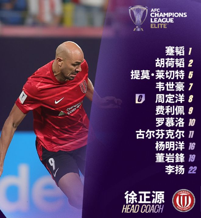本场比赛,成都蓉城在首发上派出1-蹇韬、2-胡荷韬、5-提莫-莱切特、11-古尔芬克尔、19-董岩鋒、22-李扬、8-周定洋、10-罗慕洛、16-杨明洋、7-韦世豪、9-费利佩的阵容。