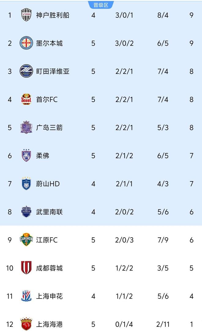 前8的球队积分非常相近,榜首和第8仅有3分之差。墨尔本城凭借着3连胜,在先赛的情况下与神户胜利船同积9分。本轮还未出战的武里南联与江原FC同积6分,并凭借净胜球优势排在第8。